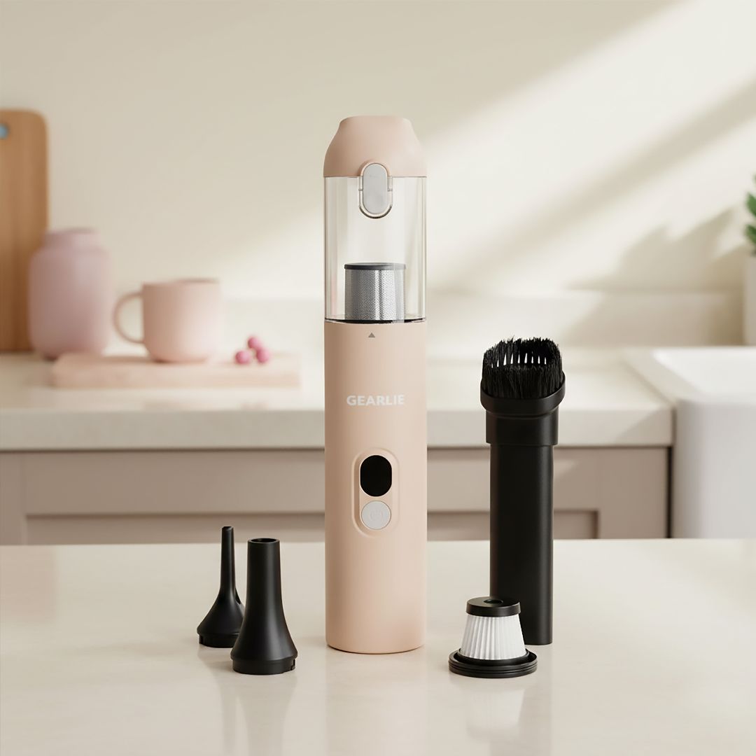 The GEARLIE™ PortalVac is the sleek, portable vacuum reimagined for the design-conscious DIYer. With a minimalist blush-toned body, clear dust chamber, and interchangeable precision nozzles, it tackles quick clean-ups with elegance and efficiency. Whether it’s stray sawdust from a furniture upgrade or crumbs in your car, the PortalVac’s lightweight build, ergonomic grip, and powerful suction keep your space pristine without compromising style. Designed to live on your counter or shelf, never hidden, it turns tidying into an aesthetically satisfying ritual.